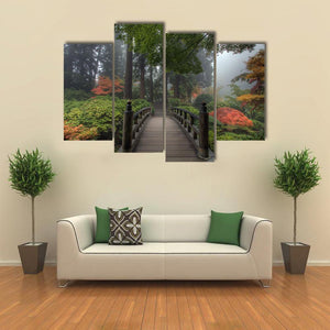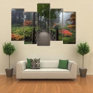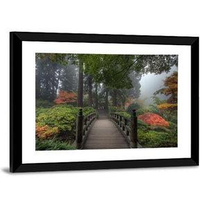 This serene canvas art captures a wooden bridge nestled in a foggy forest, surrounded by vibrant autumn foliage. The tranquil mix of greens, browns, and warm oranges creates a peaceful atmosphere, making it a lovely addition to any space.