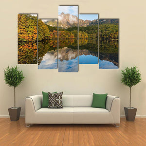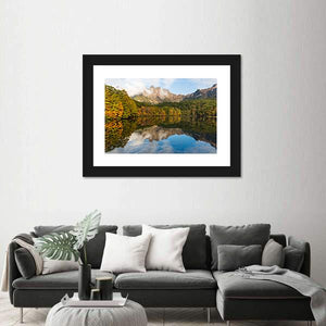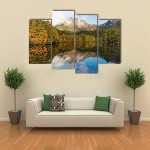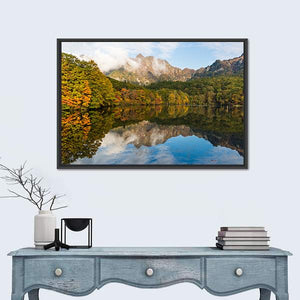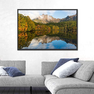 Togakushi's Lake depicts mountains with clouds around their peaks, trees in yellow and orange autumn foliage, and a calm lake that mirrors the scene. This realistic nature photograph uses orange, green and blue tones to create a serene, colorful mood that suits home living rooms, entryways, and nature-themed spaces.