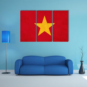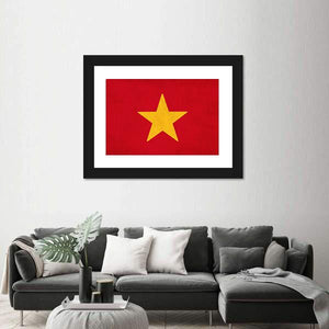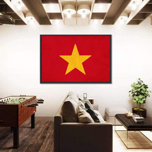 This canvas depicts the Vietnam flag with a bold, patriotic mood in a red-and-yellow palette. The design favors symmetry and a modern, minimalist look, with a subtle grunge texture that adds visual depth. It fits well in modern or minimalist interiors as a focused wall piece.