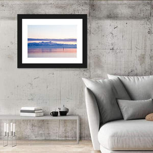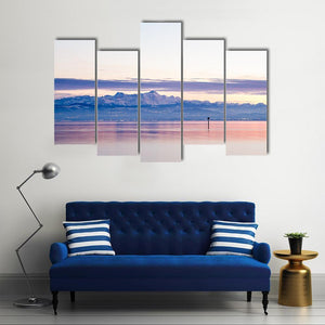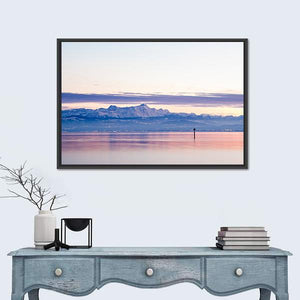 This canvas wall art captures a serene landscape featuring a stunning mountain range over Lake Constance. The tranquil scene showcases soft blues and pinks, with snow-capped peaks reflecting on calm waters, creating a peaceful atmosphere.