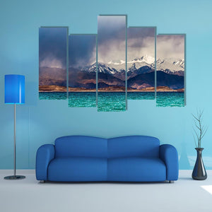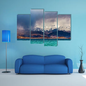 Photorealistic canvas of Karakul Lake in Pamir, showing a turquoise lake beneath snow-capped mountains and dark storm clouds. Dramatic lighting and visible rain on the mountain slopes give the scene a serene, awe-inspiring mood. Suits modern or nature-inspired rooms as a strong focal piece.