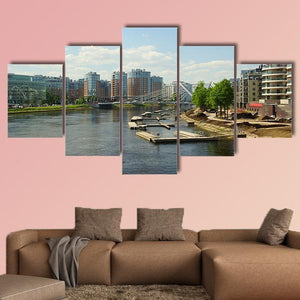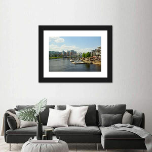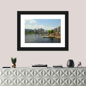 A bright, serene cityscape of the Malaya Nevka and Lazarevsky Bridge in St. Petersburg, capturing the river, modern buildings, and docked boats beneath a clear blue sky with soft clouds. This canvas brings a calm, urban feel and pairs well with modern or travel-inspired room decor.