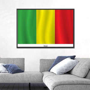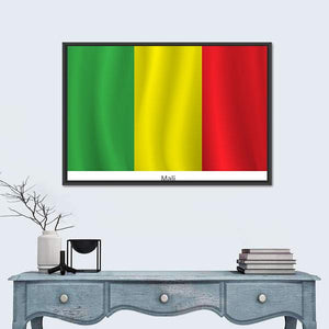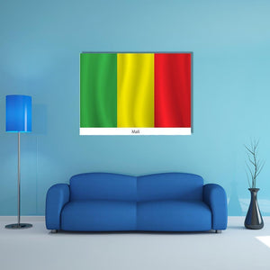 This View of Mali flag canvas presents the Mali flag in a bold, graphic composition with green, yellow and red arranged symmetrically. The print includes the word "Mali" below the flag for a clear, labeled look. It suits modern home interiors and contemporary room decor that embrace clean, colorful statement pieces.