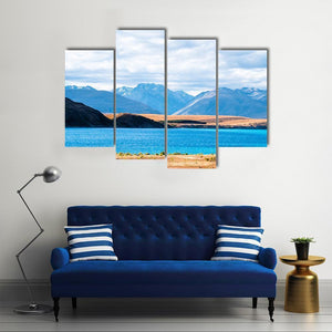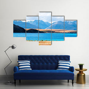 Mount Cook beside Lake Tekapo appears in a realistic, wide-angle lakeshore scene. Snow-capped peaks, a cloudy sky and a golden shoreline create a serene, majestic sense of layered depth, rendered in blues, browns, white and gray. It works well in modern, nature-inspired rooms.
