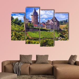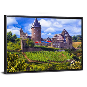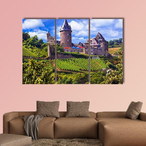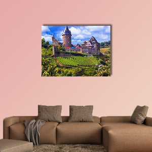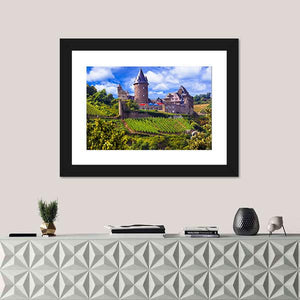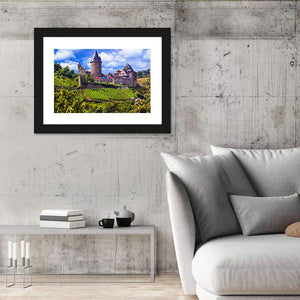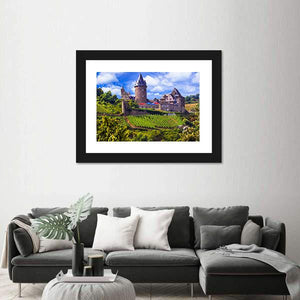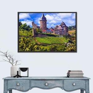 A realistic landscape that places a stone castle with towers above rows of grapevines and distant mountains beneath a blue sky dotted with fluffy clouds. The green-and-blue palette and picturesque, majestic mood work well with modern or nature-inspired home décor.