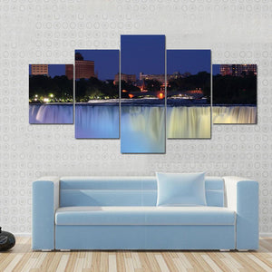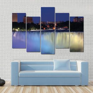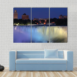 This beautiful canvas features a serene waterfall set against a vibrant night sky filled with city lights. The magical blend of blue, purple, and yellow hues creates a tranquil atmosphere, making it ideal for modern decor.