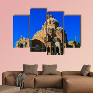 Basilica Of Saint Paul Canvas Wall Art shows a centered, low-angle view of a cathedral with ornate domes, arched windows, and a detailed facade, creating a majestic, bright presence. Warm oranges and yellows sit against clear blues and white sky tones in a realistic architectural style. It suits modern home decor as a strong architectural focal point.