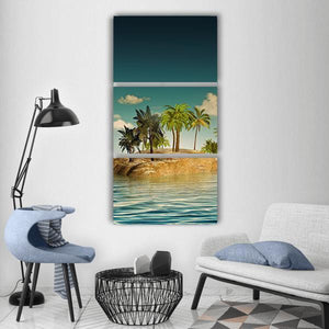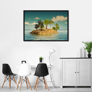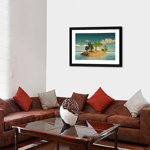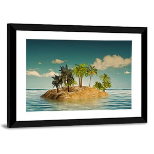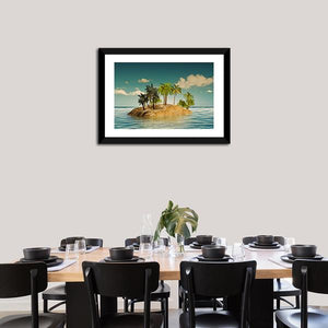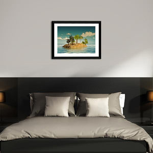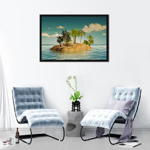 Island In The Sea features a small tropical island with palm trees set in calm ocean water beneath a clear, cloud-specked sky. The realistic composition uses blue, teal, green, and brown tones with rule-of-thirds depth to create a serene, idyllic mood that suits coastal or modern room decor.