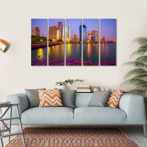 Capture the vibrant essence of Bangkok with this modern canvas art featuring a stunning city skyline at dusk. Lively purple flowers in the foreground complement the reflections of numerous skyscrapers on the lake, creating a serene urban atmosphere.