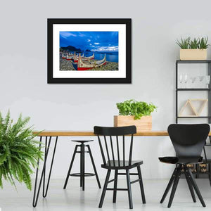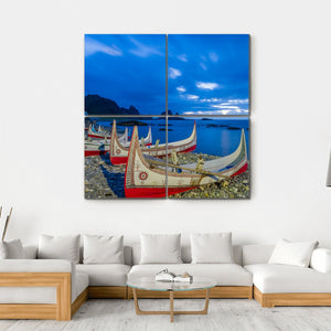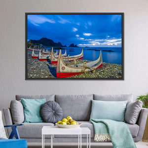 This canvas showcases traditional carved boats anchored by a rocky shore at Orchid Island. The tranquil scene features a serene blend of blues and whites, highlighted by dramatic clouds. Ideal for anyone looking to add a touch of nature's beauty to their wall decor.