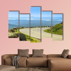 Cadillac Mountain Drive Canvas Wall Art shows a realistic landscape: a winding road with yellow lines, rocky embankments, and distant islands meeting the ocean under a clear, daytime sky. The scene reads as serene and adventurous, with blue, green, gray and yellow tones that emphasize perspective and depth. It works well in modern home settings such as living rooms or entryways.