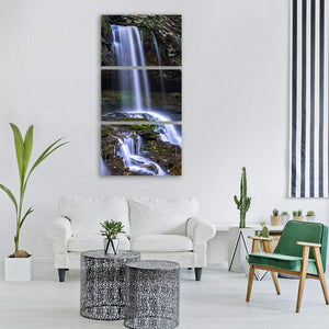 Featuring a photorealistic waterfall rushing over moss-covered rocks, this print uses motion blur to convey flowing water. Greens, browns, whites and blues create a serene, natural mood that fits modern or nature-inspired rooms.