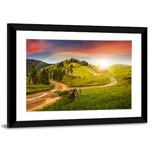 This vibrant autumn landscape features rolling hills, a dirt road, and a rainbow. The scene evokes a serene and hopeful atmosphere, inviting warmth and nature into your space.