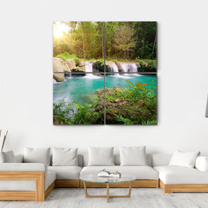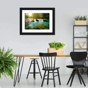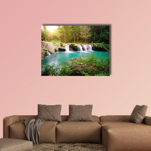 This canvas features a vibrant waterfall nestled in a tropical forest, capturing sunlight as it streams through lush foliage. Its serene blues and greens evoke a refreshing atmosphere, making it a beautiful addition to your home.