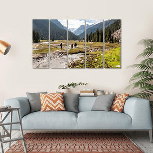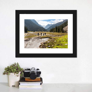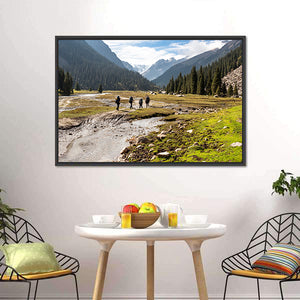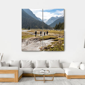Experience the beauty of the Tein Shan Mountains with this canvas wall art featuring adventurous hikers amidst a serene landscape. The artwork captures a winding river, coniferous forest, and majestic snow-capped peaks, bringing the great outdoors into your space.