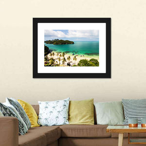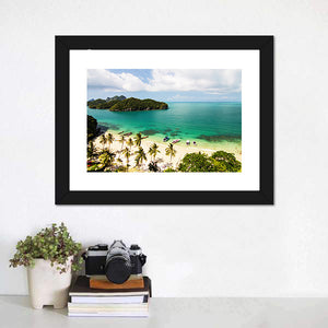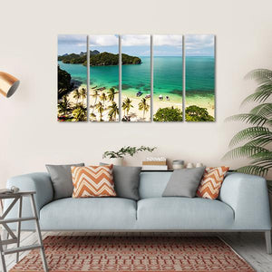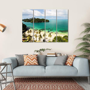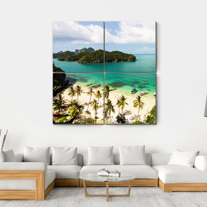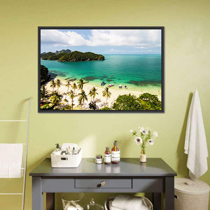 This canvas wall art captures the serene beauty of tropical islands and beaches in Thailand. With vibrant blues and greens depicting clear turquoise waters and lush palm trees, it invites a sense of tranquility and a vacation-like mood. Perfect for a nature lovers' decor.