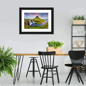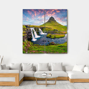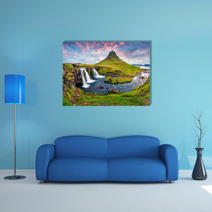 This canvas print captures the serene beauty of Iceland's Kirkjufellsfoss waterfall, framed by the majestic conical peak of Kirkjufell. The tranquil scene features cascading waterfalls, a blue river, and dramatic pink clouds, creating a peaceful atmosphere for any space.