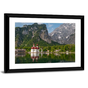 Capture the serene beauty of Konigssee Lake with this stunning canvas wall art. Featuring a picturesque scene of a twin red-domed church reflecting on the lake, framed by majestic snow-capped mountains, this realistic artwork brings nature's tranquility into your space.