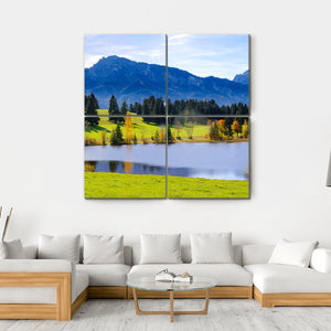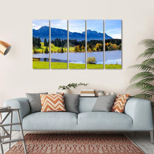 This canvas wall art beautifully captures the serene beauty of a tranquil lake surrounded by majestic mountains and lush forests. With its rich palette of blues and greens, it evokes a picturesque autumn scene under a clear blue sky, making it a perfect addition to your nature-inspired décor.
