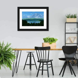 This striking artwork captures a tranquil lake nestled among majestic mountains and lush forests. The serene blues and greens invite a sense of peace and connection with nature, making it an ideal addition to any room seeking a calming atmosphere.