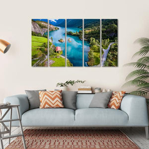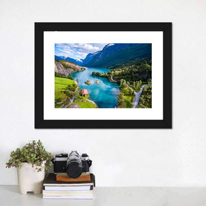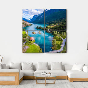 Capture the serene beauty of Lake Lovatnet in Norway. This stunning canvas artwork features turquoise waters framed by majestic snow-capped mountains and lush green hills, bringing a tranquil vibe to any space.