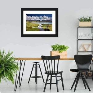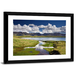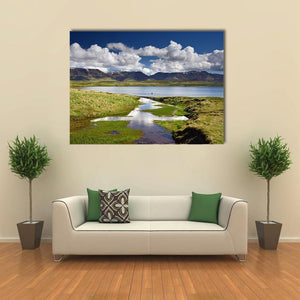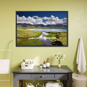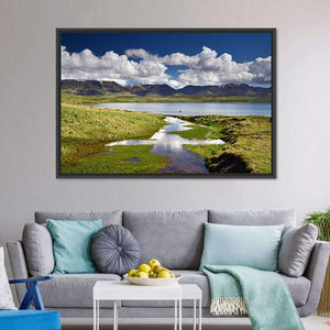 This canvas artwork features the serene beauty of Lake Svinavatn in Iceland, showcasing shimmering waters, snow-capped mountains, and fluffy clouds. The natural palette of blue, green, and white brings a peaceful atmosphere, making it a lovely addition to any nature-inspired decor.
