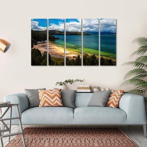 Bring a touch of Colombia into your space with this vibrant canvas wall art featuring Lake Tota. This serene scene captures boats gliding over the water, framed by lush green trees and bright clouds, evoking a sense of peace and natural beauty.