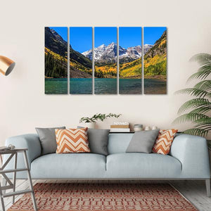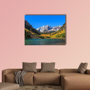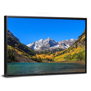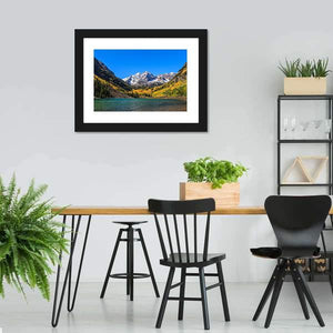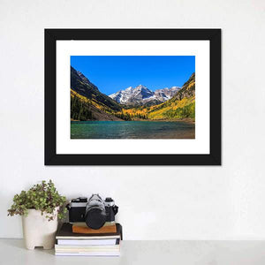 This landscape captures the stunning beauty of the Maroon Bells, featuring majestic snow-capped mountains alongside a tranquil turquoise lake. The colorful autumn trees adorned in yellow and orange foliage add warmth to the serene atmosphere, making it a perfect addition to any space.