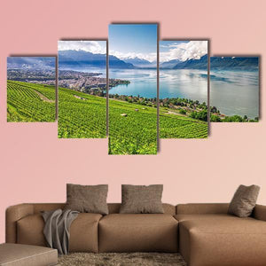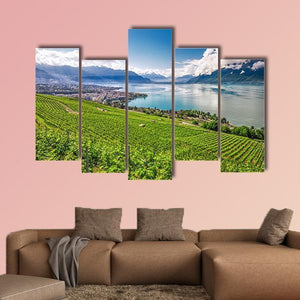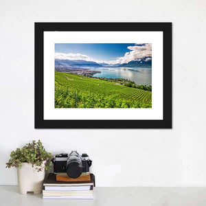 Montreux City With Swiss Alps Canvas shows a realistic lakeside landscape with terraced vineyards, a calm lake, and snow-capped mountains beneath a partly cloudy sky. The scene feels serene, picturesque, and vibrant, with greens, blues, whites, and greys that suit modern living spaces and everyday room decor.