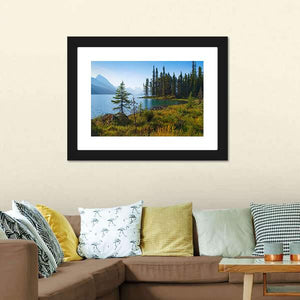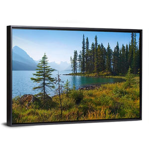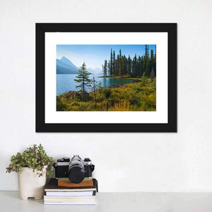 This enchanting landscape captures a serene lake set against tall evergreen trees and distant mountains. The calming palette of blue, green, and white evokes a peaceful atmosphere, making it a wonderful addition to your home decor.