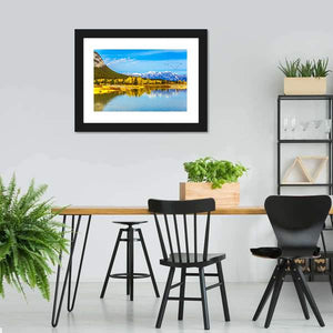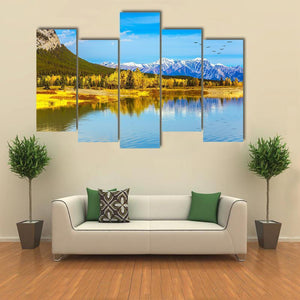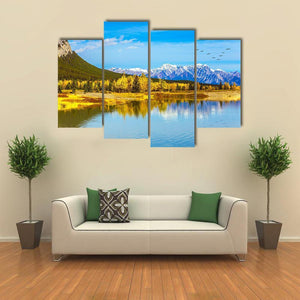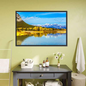 This landscape shows golden autumn trees beside a calm lake, with snow-capped mountains and a flock of birds in flight. Realistic, vibrant blues, greens and yellows give the scene a peaceful, natural feel that suits modern living rooms or bedrooms.