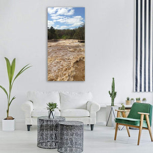 A realistic landscape of a muddy flood flowing through a forest, with churning whitecaps beneath fluffy clouds and a dramatic, powerful mood. Earthy browns, deep greens and cool blues guide the eye, with composition following the rule of thirds for clear balance. Suited to modern or nature-inspired rooms as wall decor.
