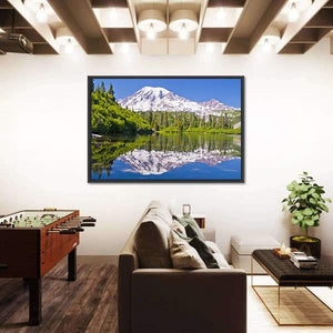 This stunning landscape artwork captures a serene view of Mt. Rainier reflecting in the calm waters of Bench Lake. The piece features a majestic snow-capped mountain surrounded by lush green trees and a clear blue sky, evoking a tranquil atmosphere perfect for any nature lover.