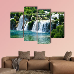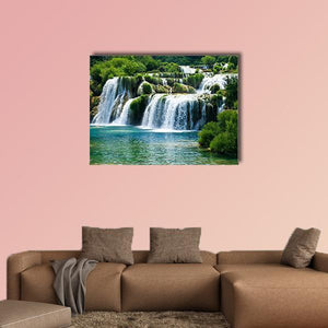 This realistic canvas shows a multi-tier waterfall surrounded by vibrant green foliage and blue water. The cascading motion and natural palette create a serene, refreshing mood. A nature-focused piece that fits modern home decor and room decor with a landscape theme.