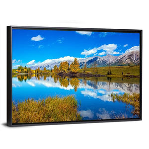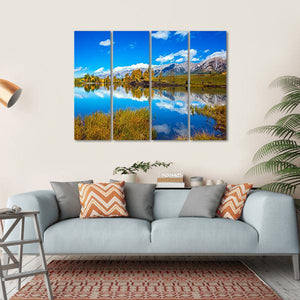 This serene landscape features a tranquil lake surrounded by snow-capped mountains and vibrant autumn foliage. The reflection of clouds in the water enhances the peaceful atmosphere, making it a beautiful addition to any nature-inspired decor.