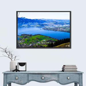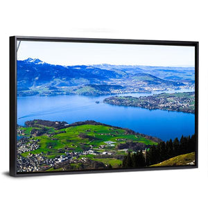 This canvas wall art captures a serene landscape featuring Lake Lucerne, surrounded by snow-capped mountains and lush green hills. The realistic depiction invites a sense of peace, making it an ideal addition to any nature-inspired decor.