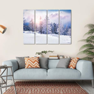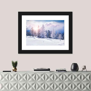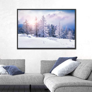 This canvas art captures a serene winter landscape with snow-covered trees illuminated by soft sunlight. The blend of pink and blue clouds adds a peaceful touch, making it a beautiful piece for any room that craves a touch of nature's tranquility.