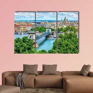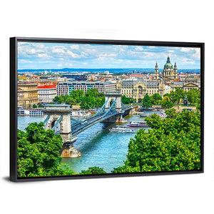 A realistic landscape of Budapest’s Chain Bridge crossing the Danube, shown from a high-angle daytime view. Rich blues, greens, browns, and whites create a vibrant, scenic urban mood; the stone bridge with suspension cables, a domed building in the distance, boats on the river, and lush trees appear clearly. Suits modern room decor as a focal wall piece in home living spaces.