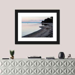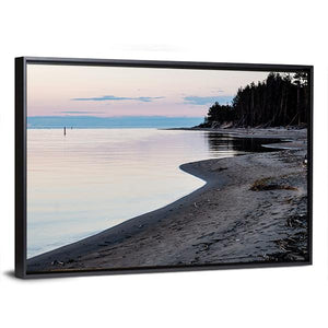 This canvas wall art captures the serene beauty of a calm river at sunrise in Latvia. With soft hues of blue, gray, green, and pink, it evokes a tranquil atmosphere that reflects nature's peacefulness.