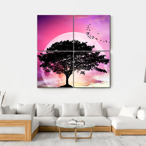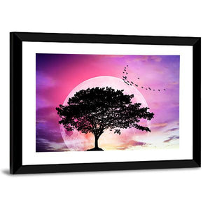 This canvas art captures a mystical night scene featuring a serene silhouette of a tree against a dreamy full moon. Hints of purple and pink bring a tranquil vibe that complements any nature-inspired décor.