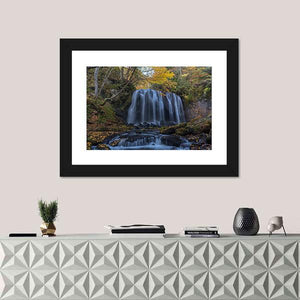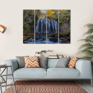 Experience the serene beauty of a cascading waterfall surrounded by vibrant autumn leaves and rocky forest. This realistic canvas print captures the motion of flowing water, creating a peaceful atmosphere for your home.