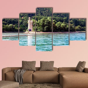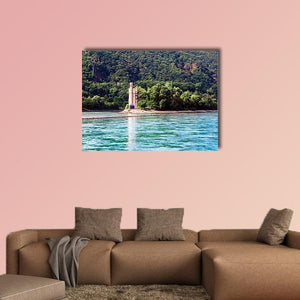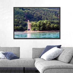 Mouse Tower, Germany, sits on a small island in this realistic landscape canvas, showing a tall, slender tower beside a river and dense green trees on the hillside. Rendered in blue, green, white, and brown and composed with the rule of thirds, the scene feels serene and natural. Works well as nature-inspired wall decor for living rooms, entryways, or home offices.