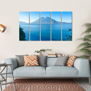 This stunning canvas captures a serene view of Lake Atitlan, showcasing two prominent mountains and a small boat amidst lush greenery. The tranquil blue and green palette evokes a peaceful, expansive atmosphere, making it a perfect addition to any nature-inspired space.