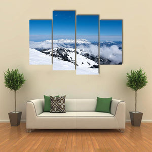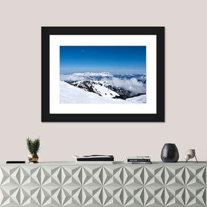 This photographic canvas captures a winter view of the Alps from above Kitzbuhel, with snow-covered slopes, distant peaks and puffy clouds against a blue sky. The composition uses depth and rule-of-thirds framing to convey a serene, vast, crisp atmosphere that fits modern living rooms and bedrooms.