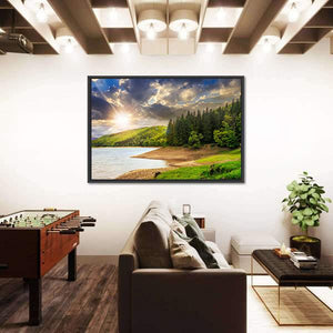 Capture the serene beauty of a lakeside scene with this canvas art. Featuring a peaceful lake surrounded by a dense evergreen forest, it brings a vibrant touch of nature to any space.