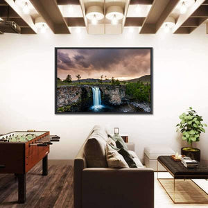 This canvas captures a serene waterfall cascading over rocky cliffs, framed by trees under a dramatic, stormy sky. With its rich palette of blue, grey, green, and brown, it evokes a sense of tranquility and natural beauty, making it a wonderful addition to any nature-inspired décor.