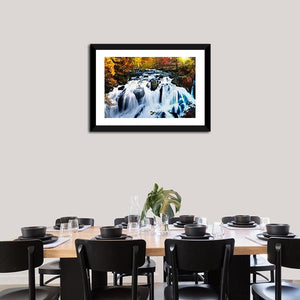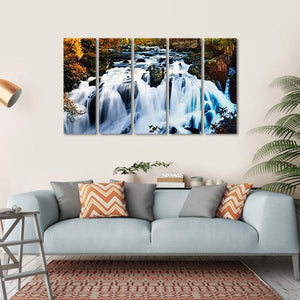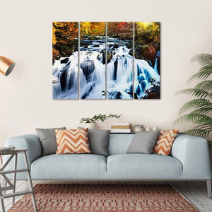 This vibrant canvas artwork captures the dynamic flow of a stunning waterfall surrounded by autumn trees and rocks. The sunlight filters through the foliage, creating an energetic and natural atmosphere that brings the tranquility of nature into your home.