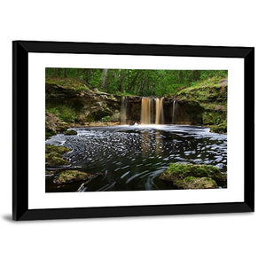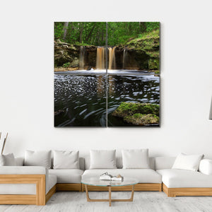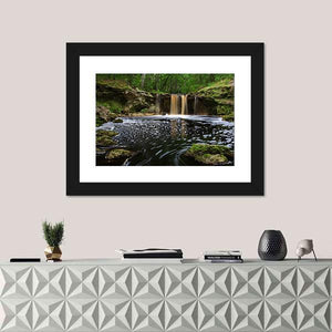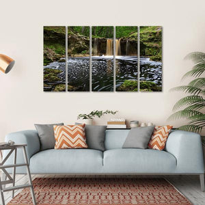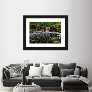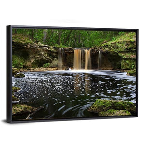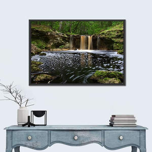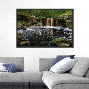 Experience the serene beauty of a cascading waterfall in this striking canvas wall art. The vibrant greens and tranquil blues capture a peaceful forest scene, with white foam dancing on the water's surface and mossy rocks grounding the composition. Perfect for nature lovers and those seeking a calming ambiance.