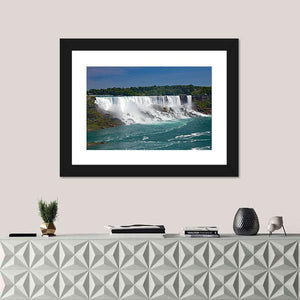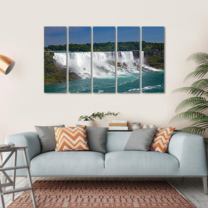 This artwork captures the majestic Niagara Falls from the Canadian side, highlighting the powerful rush of water surrounded by lush greenery and rocky landscapes. The refreshing palette of blues, greens, and browns, along with mist rising from the falls, creates a captivating scene that brings nature's beauty into your space.
