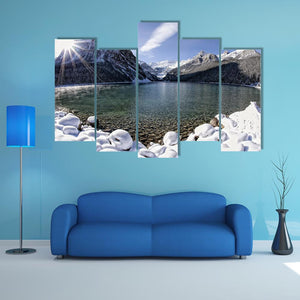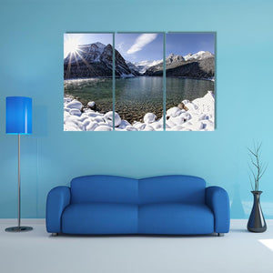 A photographic landscape of Lake Louise, this canvas captures snow-covered mountains, clear lake water and snow-dusted rocks with a low-angle, wide perspective. The cool blue, white and gray palette and a bright sunburst create a serene, majestic, crisp winter atmosphere — a calm focal point for nature-themed room decor.